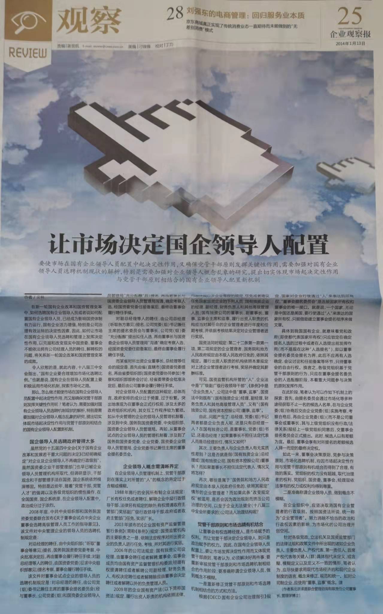 2014年1月,求是咨詢董事長、《改革內(nèi)參》特約研究員安林博士特邀在《改革內(nèi)參》(綜合01/24)發(fā)表了一篇重要文章:《讓“市場”在國企領(lǐng)導(dǎo)人配置中起決定性作用》。文中通過研究大膽提出“讓董事會差額選聘經(jīng)理人”的改革主張。后又通過建言和提案等形式積極向上反映。