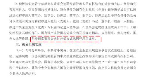 2017年5月3日《國務(wù)院辦公廳關(guān)于進一步完善國有企業(yè)法人治理結(jié)構(gòu)的指導(dǎo)意見》(國辦發(fā)〔2017〕36號)正式頒布。文件正式提出:“積極探索董事會通過差額方式選聘經(jīng)理層成員。”