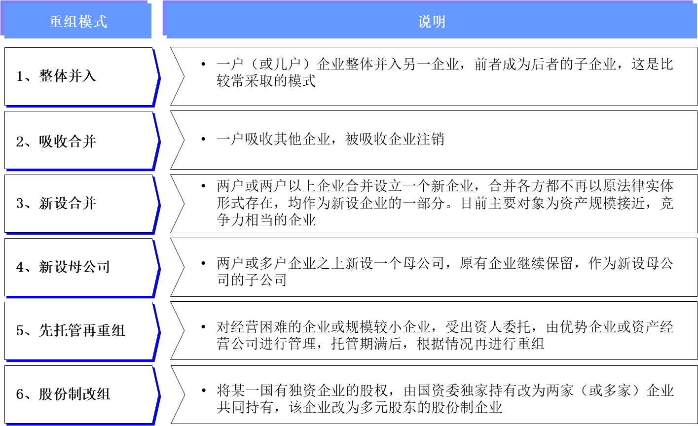 以中央企業(yè)為例,重組主要有六種模式:整體并入、吸收合并、新設(shè)合并、新設(shè)母公司、先托管再重組、股份制改組。