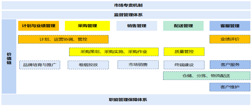那么,煙草商業(yè)企業(yè)應(yīng)如何進(jìn)一步促進(jìn)高質(zhì)量發(fā)展?筆者通過咨詢實踐和研究認(rèn)為,煙草商業(yè)企業(yè)高質(zhì)量發(fā)展從根本上來說,就是要優(yōu)化企業(yè)價值鏈(如圖1所示),關(guān)鍵做法就是:在市場專賣機制、監(jiān)督管理體系和職能管理保障體系框架下,有效管控從計劃與業(yè)績管理、采購、銷售、配送到客服的價值鏈環(huán)節(jié),進(jìn)一步強化價值鏈各環(huán)節(jié)的內(nèi)部協(xié)同,打破企業(yè)內(nèi)部部門墻、業(yè)務(wù)板塊壁壘,全面系統(tǒng)地開展提質(zhì)增效工作,以實現(xiàn)企業(yè)核心競爭力的有力提升。